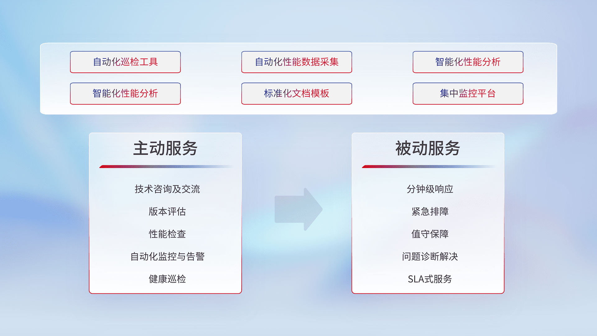 智能化工具和标准化文档,,,,保障服务质量,,,提供主动服务(包含技术咨询、、、、版本评估、、、、性能检查、、、、自动化监控与告警、、、健康巡检)和被动服务包含(分钟级响应、、、、紧急排障、、值守保障、、问题诊断解决、、、、SLA服务)。。